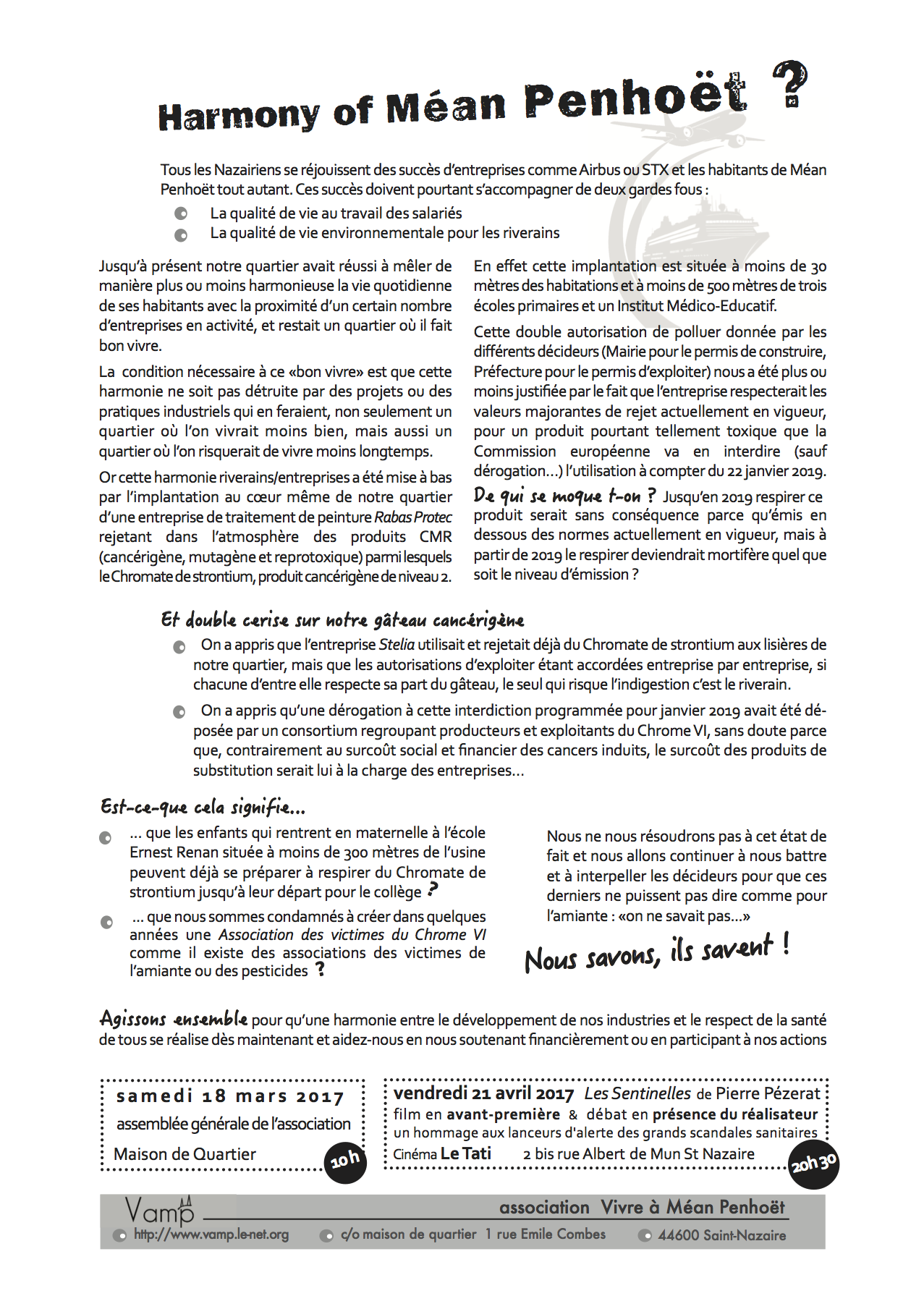 Agissons ensemble pour qu’une harmonie entre le développement de nos industries et le respect de la santé de tous se réalise dès maintenant et aidez-nous en participant à nos actions futures ou en nous soutenant financièrement.